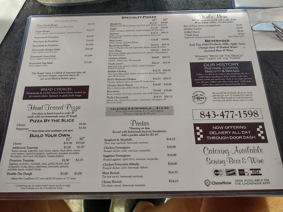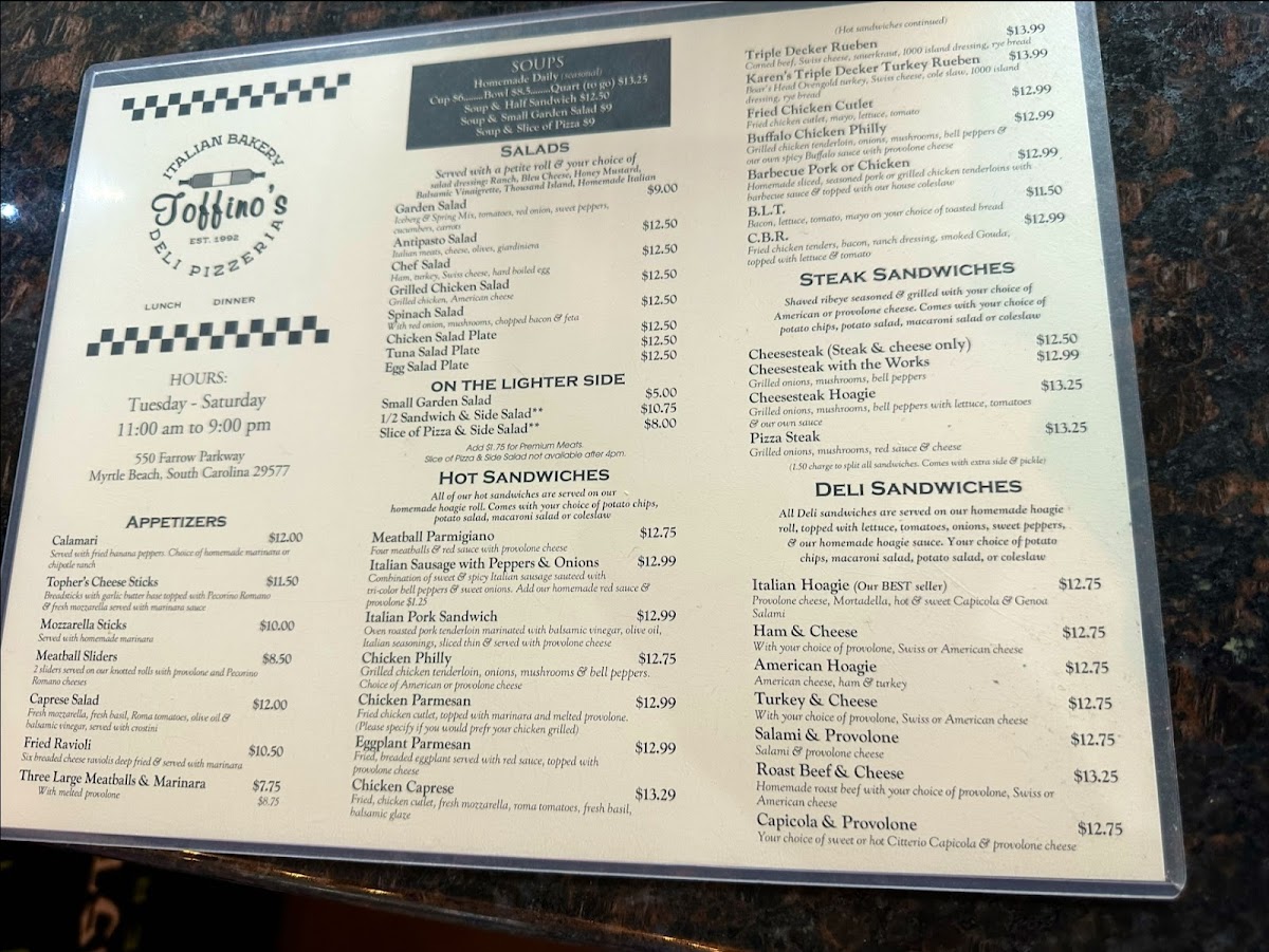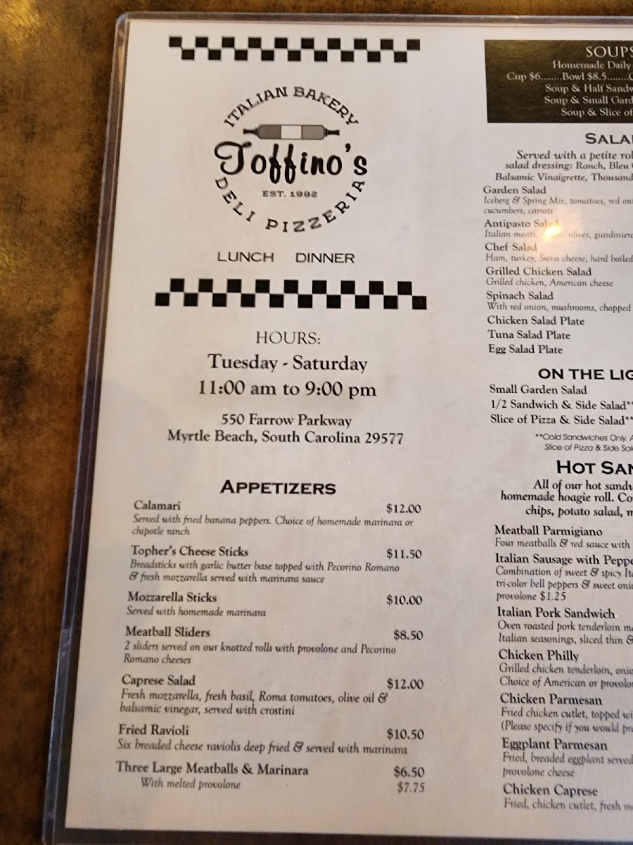 Welcome to Toffino's Italian Bakery Deli Pizzeria, located in sunny Myrtle Beach, where authentic Italian flavors come alive! The menu is a delightful journey through classic Italian fare, starting with mouthwatering starters like calamari served with marinara or cheesy Topher’s cheese sticks. For those craving something heartier, their wood-fired pizzas are standout options; the Margherita is a must-try, with fresh tomatoes, mozzarella, and basil atop a perfectly chewy crust.