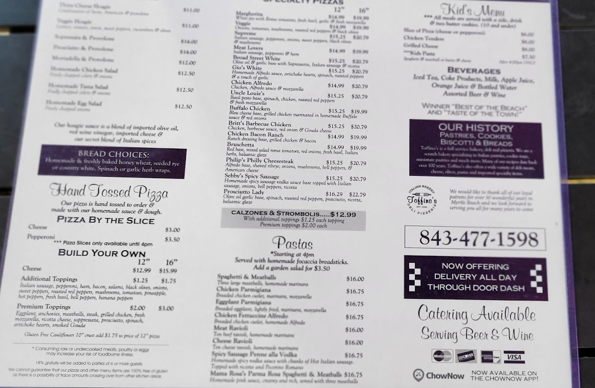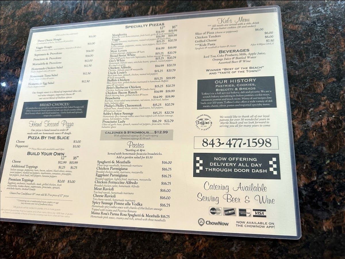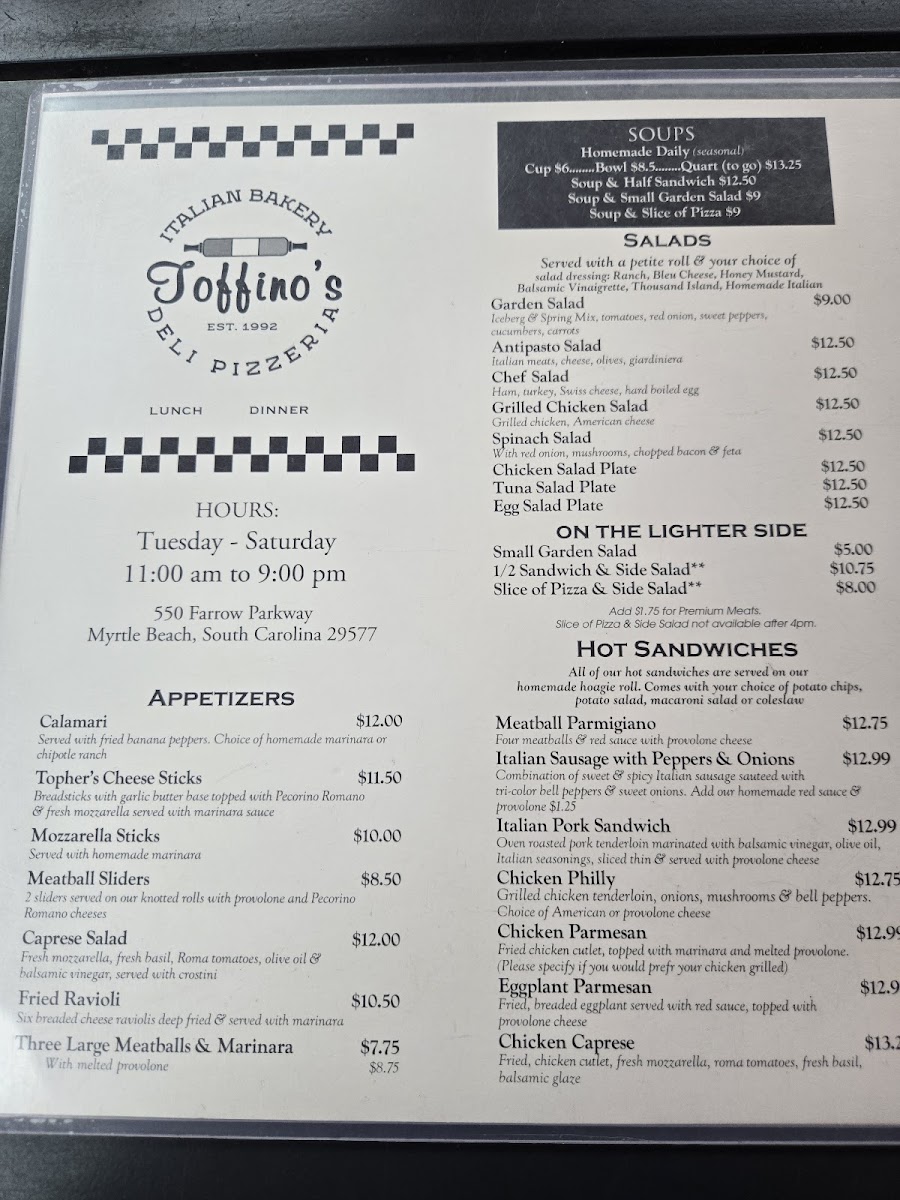Welcome to Toffino's Italian Bakery Deli Pizzeria, located in sunny Myrtle Beach, where authentic Italian flavors come alive! The menu is a delightful journey through classic Italian fare, starting with mouthwatering starters like calamari served with marinara or cheesy Topher’s cheese sticks. For those craving something heartier, their wood-fired pizzas are standout options; the Margherita is a must-try, with fresh tomatoes, mozzarella, and basil atop a perfectly chewy crust.
